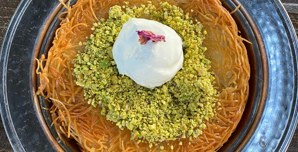 Description: Fresh cheese, shredded fillo with honey and syrup Turkish pistachio, and kaymak